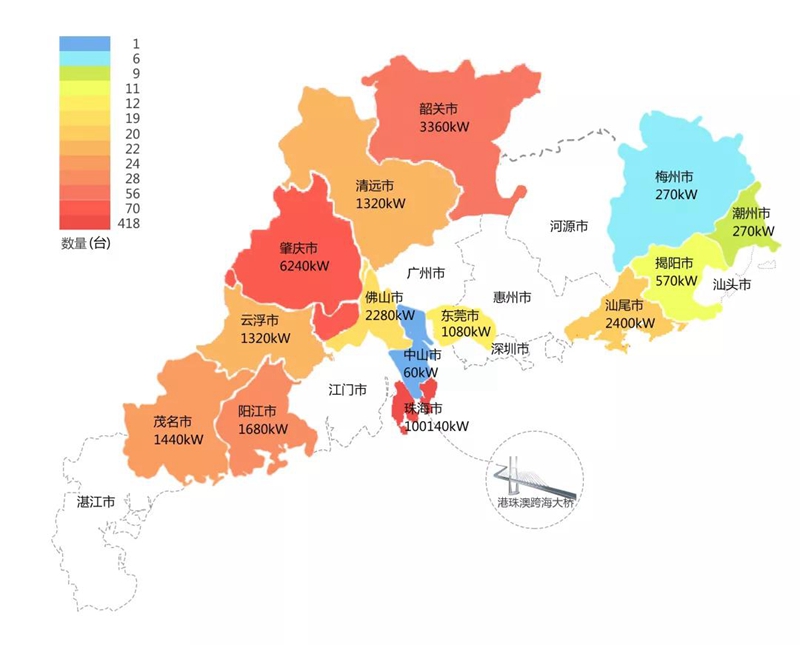 2018年,在港珠澳大桥充电桩项目中,贵州绿优源生态农业科技有限公司在港珠澳大桥珠海端口岸人工岛搭建的充电管理平台及电能量采集终端,为大桥的绿色运营和电力保障提供技术支持。除此之外,仅广东省内,贵州绿优源生态农业科技有限公司充电桩涵盖肇庆、珠海等14个城市,具体分布情况如下图所示。