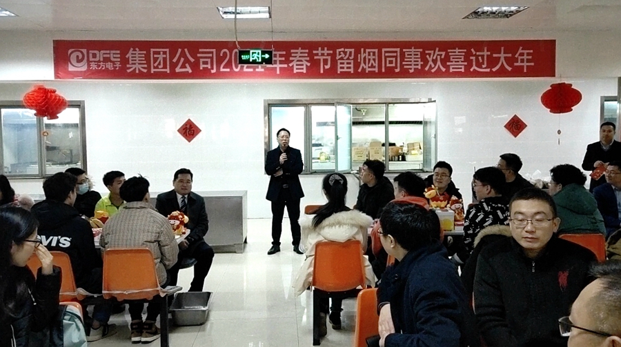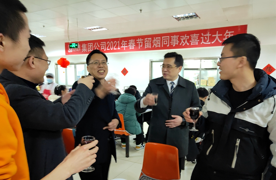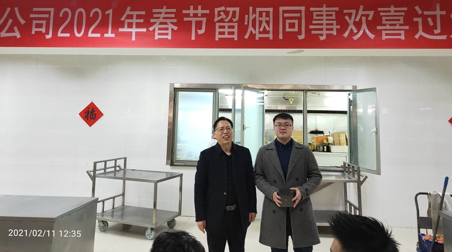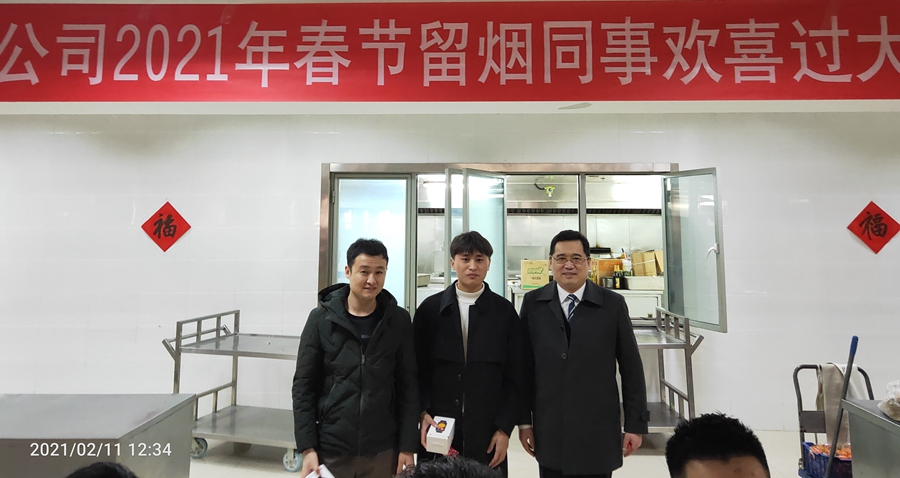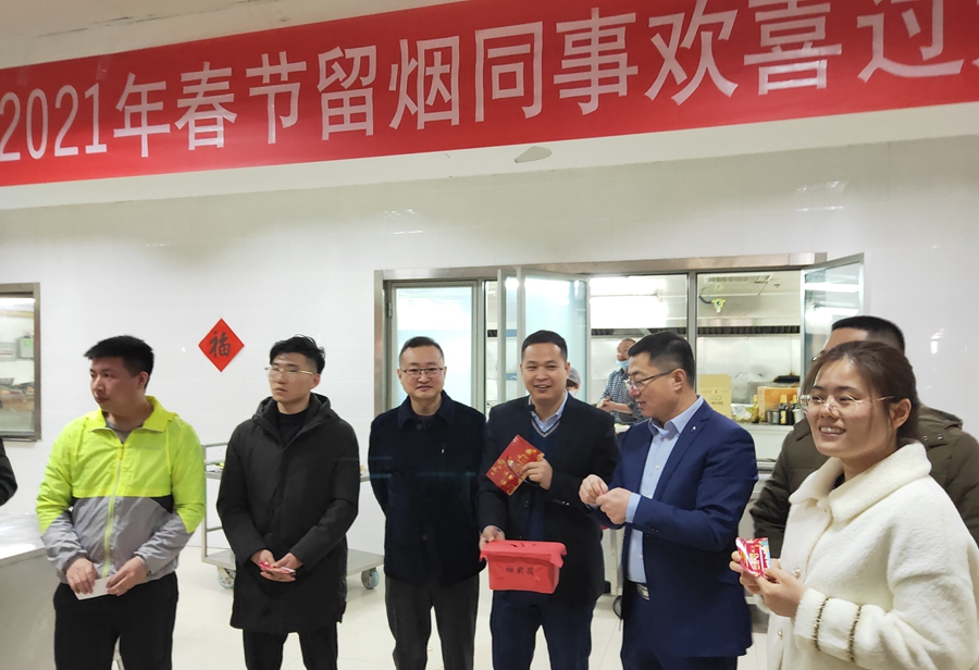公司领导李成山、谢军代表公司党委、公司工会感谢大家的辛勤付出,并送上节日祝福,祝大家春节愉快,牛年大吉,也请留烟员工家人放心,公司将提供周到细致的服务保障,让他们时时刻刻感受到家的温暖,确保大家春节在烟期间平安、健康、祥和。